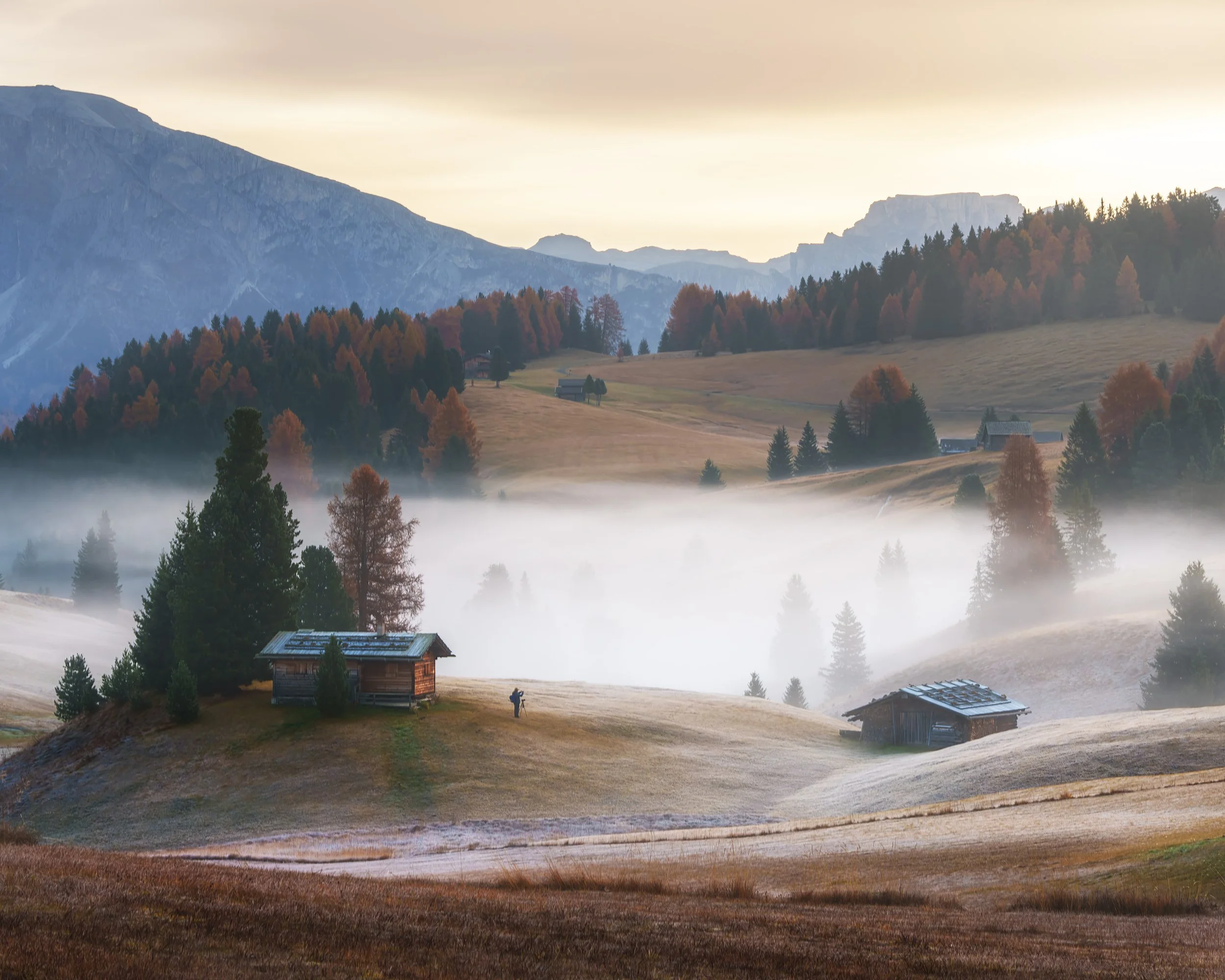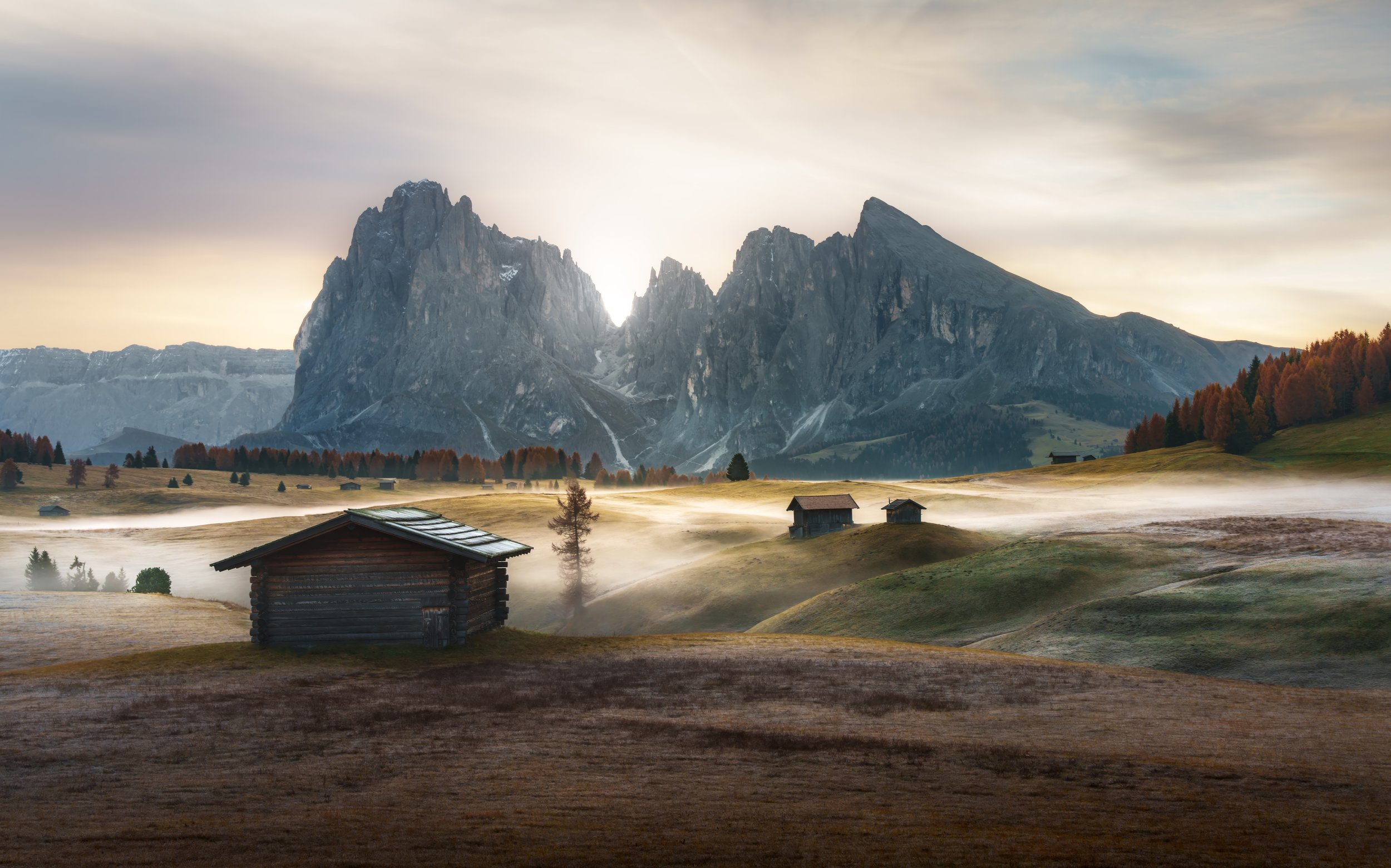 It wasn’t until our 3rd road trip around the Dolomites that we finally caught a sunrise here. If you want to catch a sunrise here, you can’t use the cable car. When it’s running, it doesn’t start early enough. Of course you could stay in a hotel on Seiser Alm, but that’s a rather expensive option! Considering the time of year we went (end of October) there was the possibility of parking at the other end. The car park at Compatsch opens at 6am, the walk across to where I wanted to catch sunrise was about an hour, and on the day we arrived, that was at around 7am!! Tight timings!!