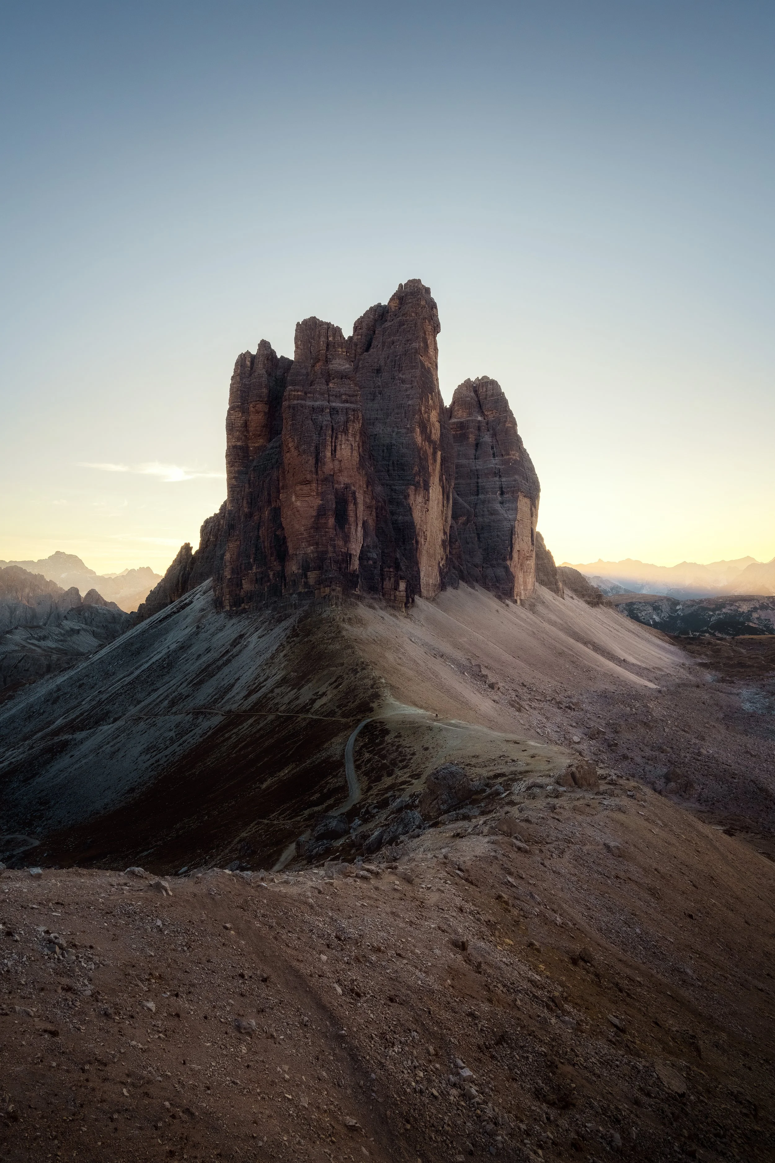 There’s a number of great spots up here, the first time you can see the North Face of the ‘Cime’ is when you reach Forcella Lavaredo (the light area in the middle of this image.) You can head right up the slope towards Monte Paterno to look back on this magnificent s-bend, photograph towards Refugio Lavaredo and the mountains behind, or look forward towards Refugio Locatelli.