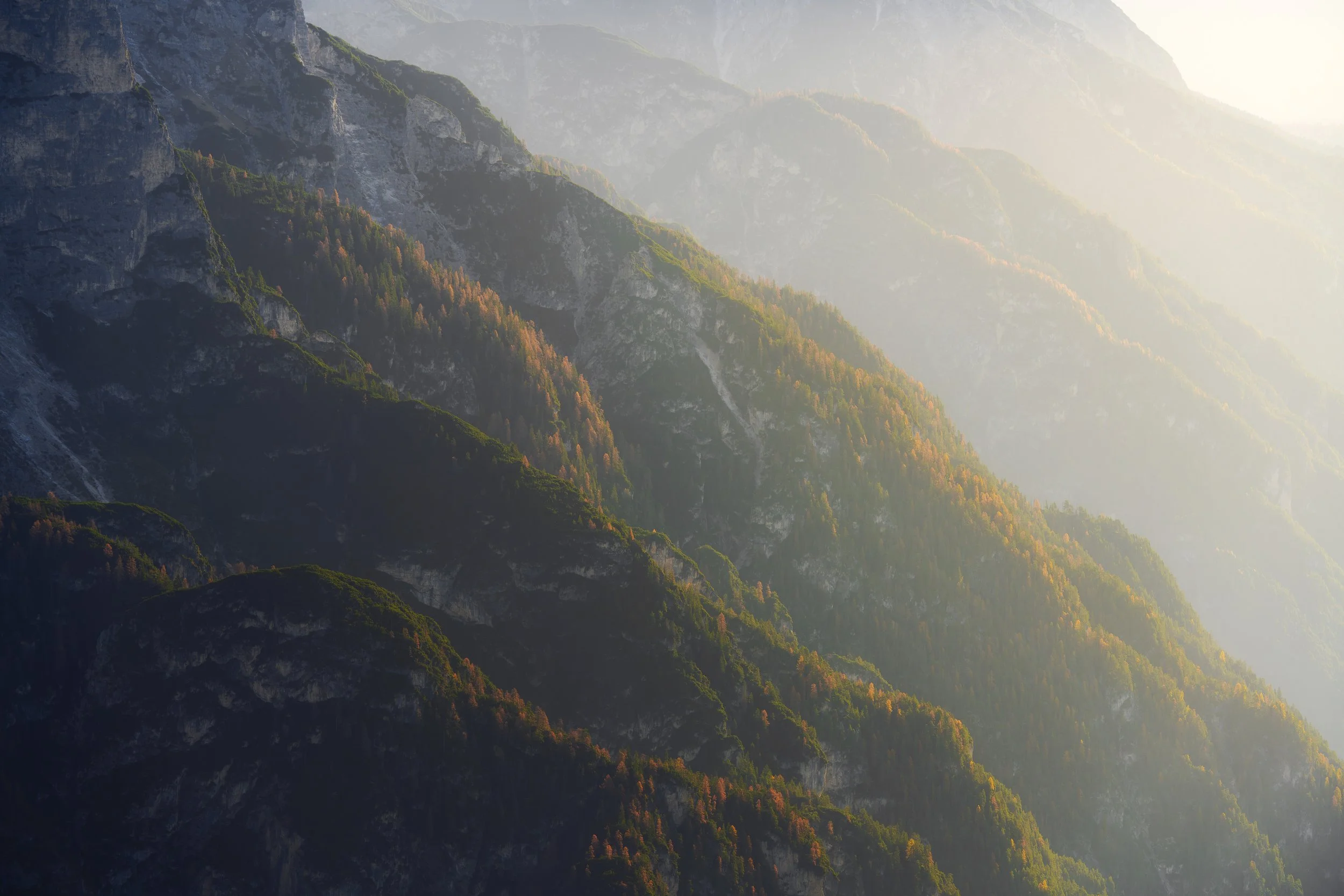 However, by the time we got there (because we decided to pop to Slovenia for a few days instead…!) the larch trees were mostly branches and twigs and the boats put away for the winter. But that didn’t stop me getting one of my favourite photos of the 2024 road trip as the sun started to come into the valley.